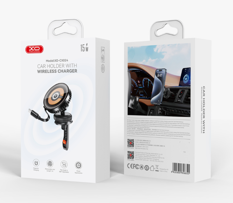 втомобильный держатель для телефона XO CX024 Transparent Magnetic 15W с кабелем (цвет — чёрный).