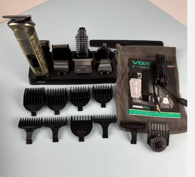 - Комплектация. Адаптер, бритвенный станок, защитный колпачок, кабель USB, кабель для зарядки, крышка для сменного ножа, масло, насадка для бороды, насадка для носа, насадка для стрижки волос в носу, насадка для ушей, подставка для зарядки, расчёска, сменный нож, щётка.