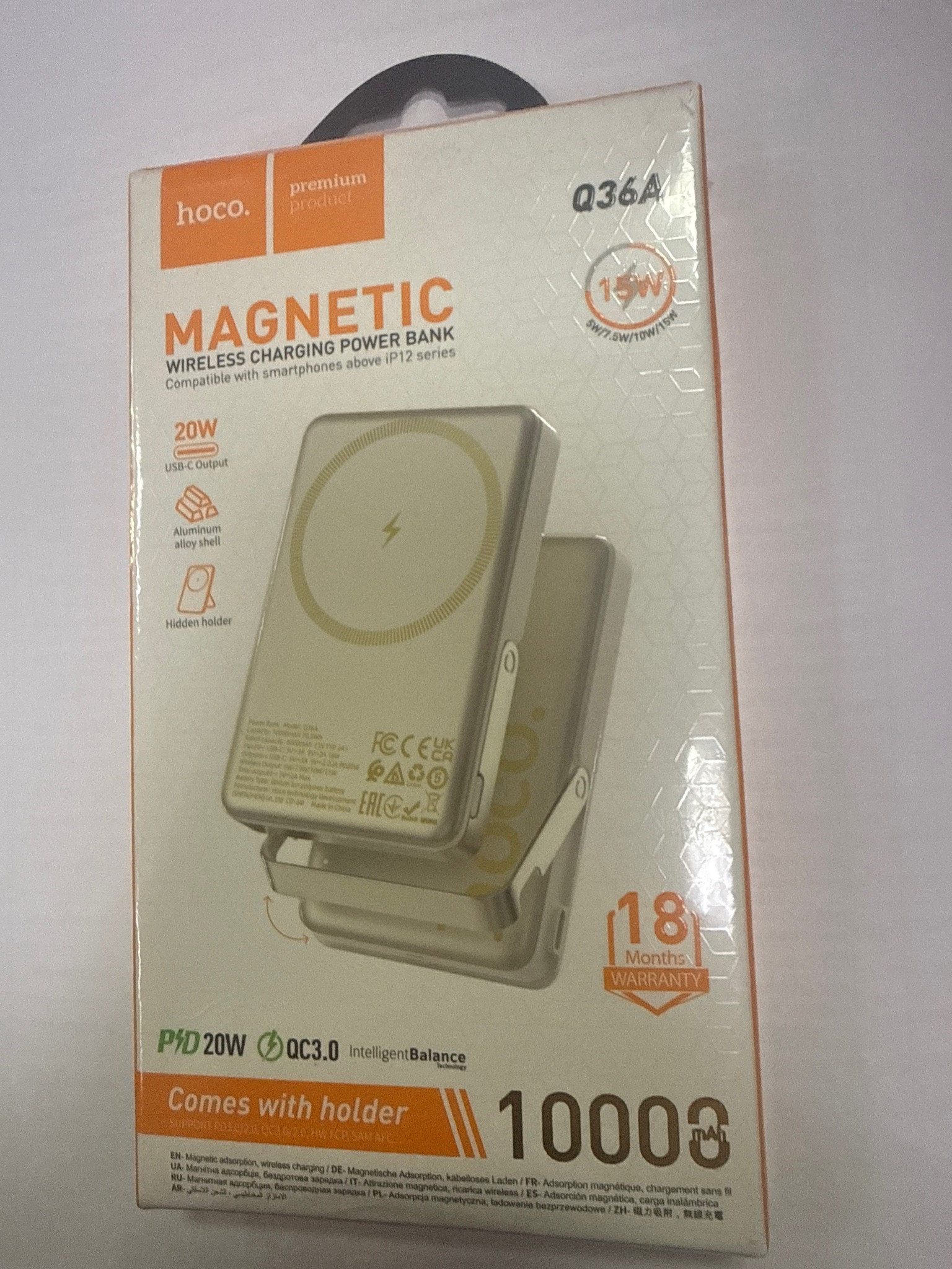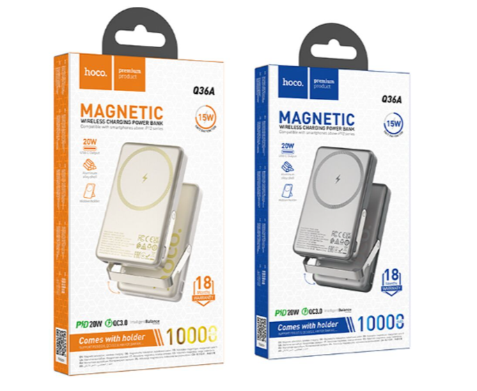 Портативный аккумулятор HOCO Sunlight Q36A Comes with Holder, Qi15W/Magsafe/ PD20W, 10000mAh, Titanium Gold — мобильный блок питания, который совмещает магнитную беспроводную зарядку с поддержкой MagSafe для iPhone 12–16 серии и беспроводную зарядку для всех остальных устройств, поддерживающих функцию Qi.
