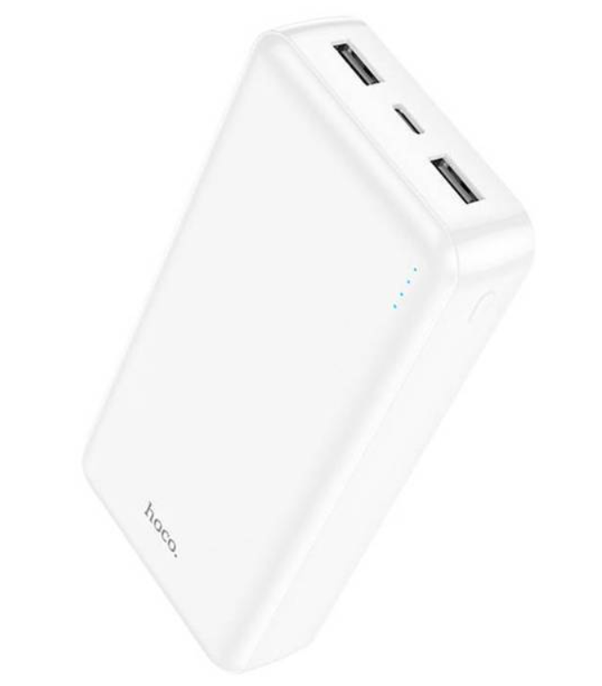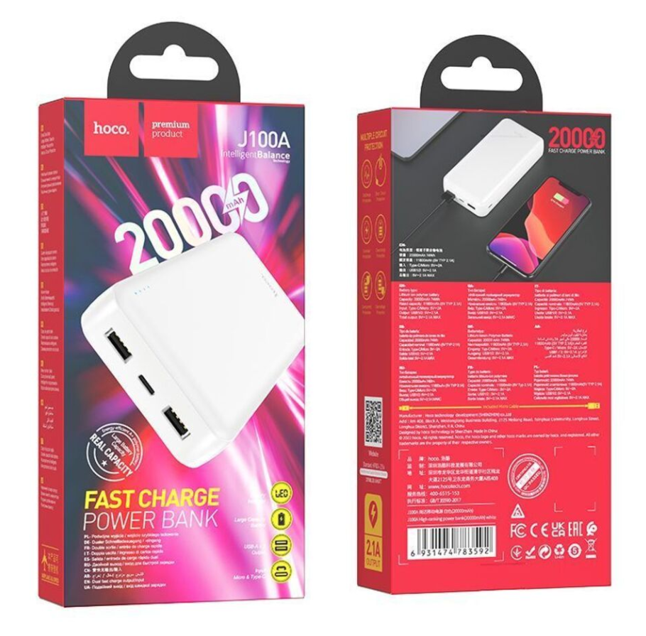 Внешний аккумулятор Hoco J100A с ёмкостью 20000 мАч белого цвета подходит для зарядки смартфонов на базе Android и iPhone, а также других гаджетов.