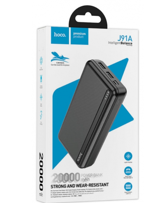 Портативный аккумулятор Hoco J91A 20000mAh чёрного цвета — устройство для зарядки устройств в путешествиях, на работе или в повседневной жизни.